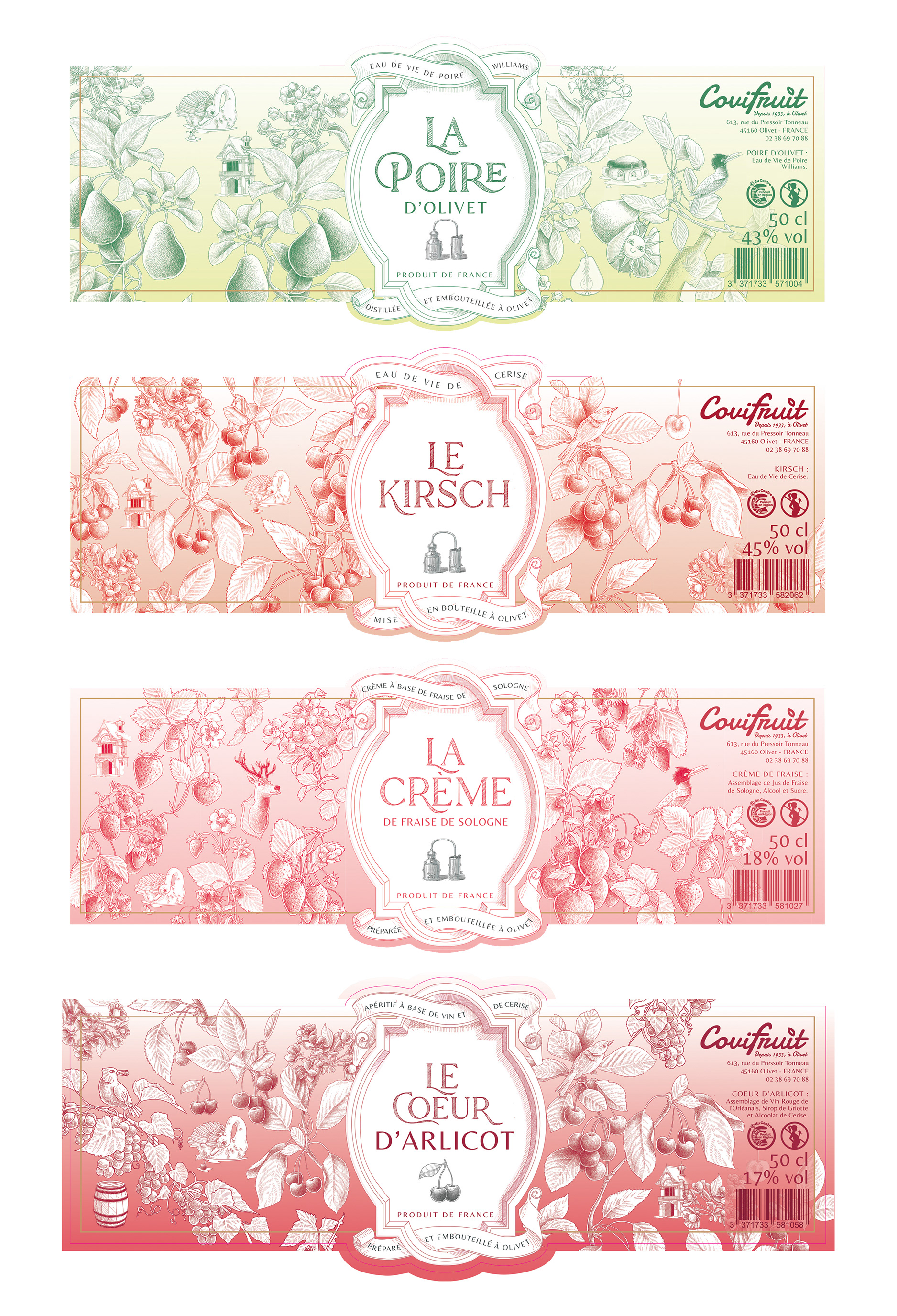 Refonte de l’identité graphique – COVIFRUIT Nous avons repensé l’identité graphique de la gamme d’alcools artisanaux de COVIFRUIT, marque emblématique du Loiret reconnue pour la qualité de ses produits locaux. L’objectif était de créer une identité visuelle forte et différenciante, en accord avec le savoir-faire traditionnel de la maison. Notre travail s’est concentré sur la valorisation de la Poire d’Olivet ainsi que des eaux-de-vie et apéritifs fruités, en puisant notre inspiration dans le terroir de l’Orléanais et la passion des artisans.Crédits photos : Ludovic LETOT