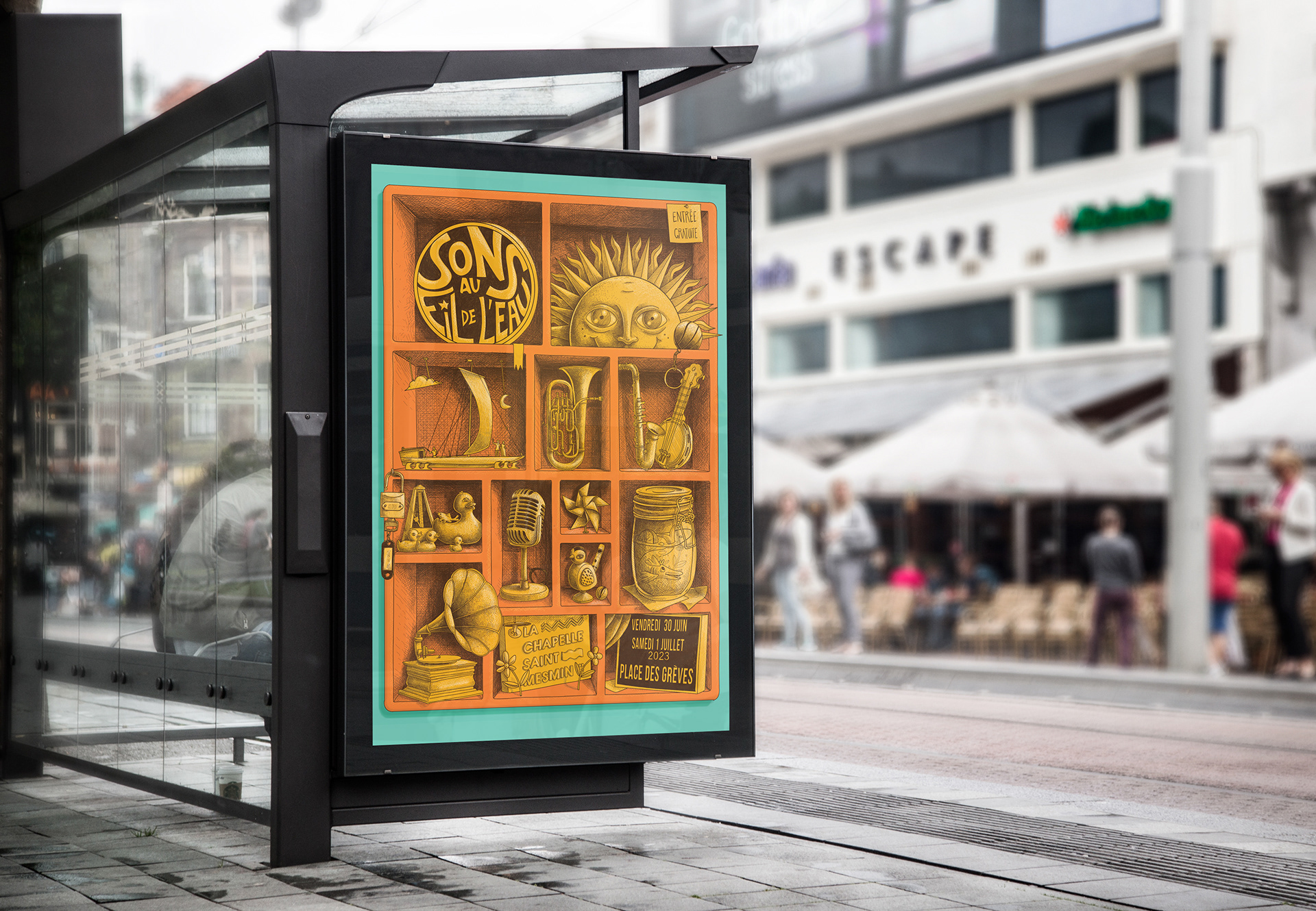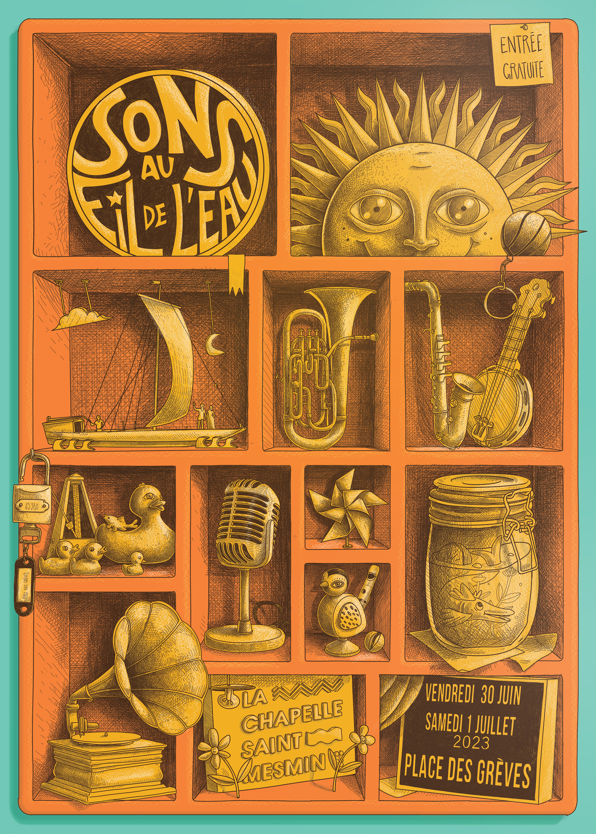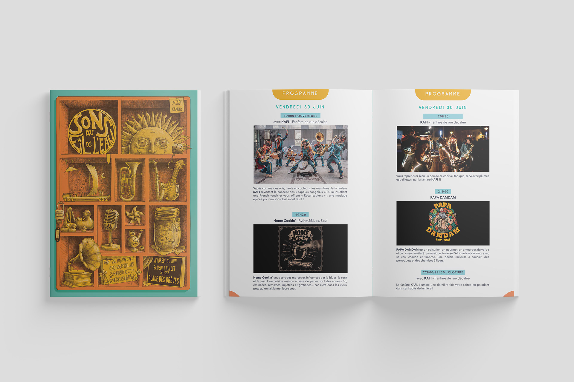 Conception graphique pour le festival "Sons au fil de l'eau" de La Chapelle-Saint-Mesmin. Nous avons créé une illustration numérique et élaboré le programme imprimé, ainsi que les déclinaisons graphiques.